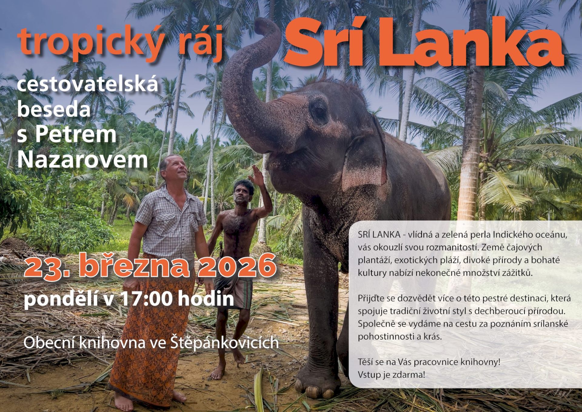 Obecní knihovna ve Štěpánkovicích Vás srdečně zve na cestovatelskou přednášku pana Petra Nazarova o fascinující zemi Srí Lanka, která se uskuteční v pondělí 23. března 2026 v 17.00 hodin v prostorách knihovny.